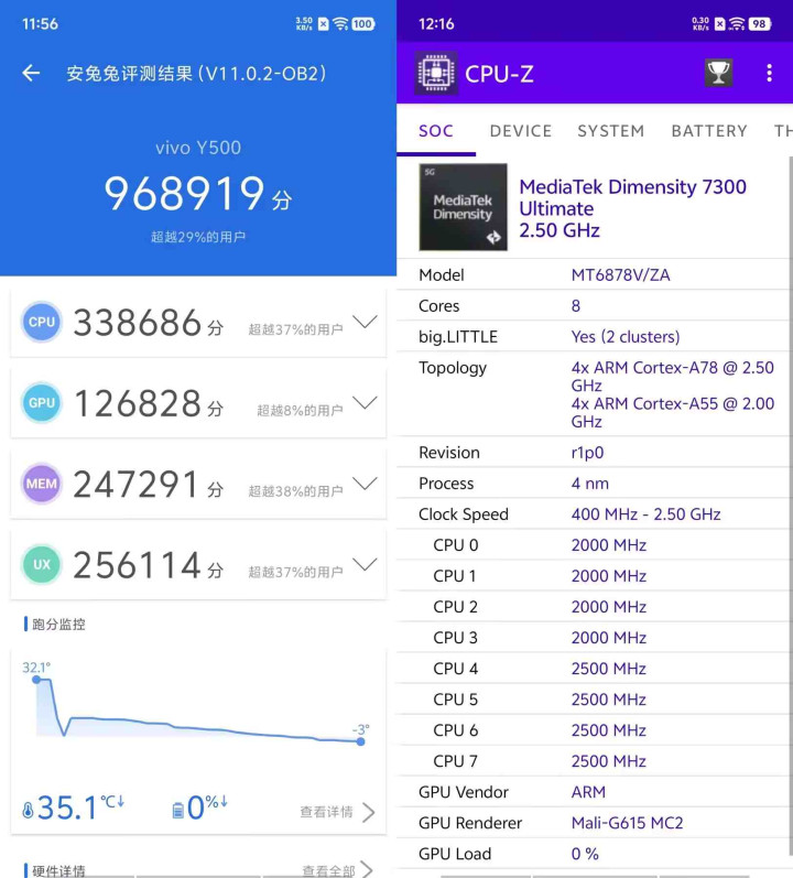 再连络vivo Y500配备了一颗天玑7300八核搞定器,在安兔兔跑分快要100万分的性能,让举座功耗与性能带来很平衡实用的施展。