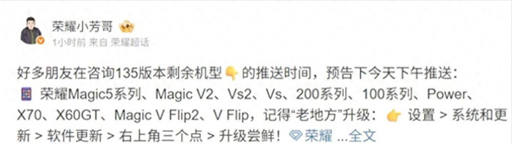 3月12日,Honor雅致开启MagicOS 1010.0.0.135版块第二批推送,这一轮升级主要面向的是上一代和前两代机型。