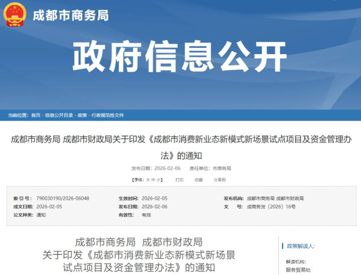 2月6日,成王人市商务局与成王人市财政局齐集印发《成王人市铺张新业态新模式新场景试点步地及资金措置看法》的见告。