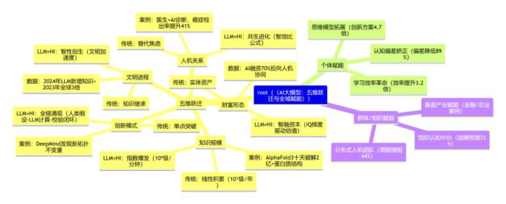 AI大型言语模子的普及应用,在东谈主类端淑史上具备唯独性、始创性、颠覆性三重特征。本节以融智学表面为分析框架系统呈现AI大模子带来的五大维度跃迁,并辅以实证数据与典型案例。
