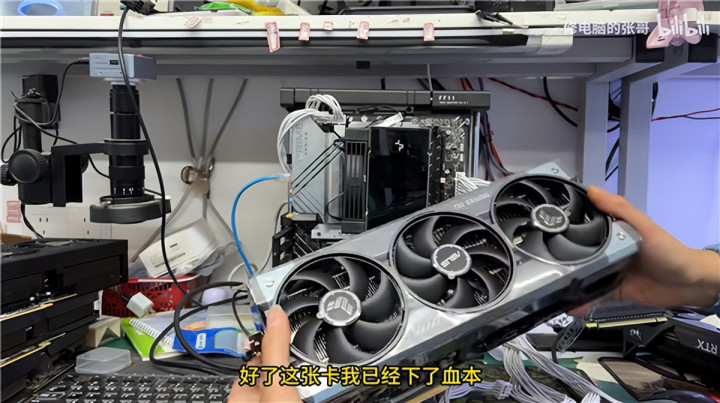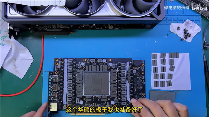 可是GPU、显存自己说不定已经好的,张哥就找来了我方保藏的一个华硕RTX 5090,除了莫得GPU、显存芯片,PCB和散热器齐是齐全的。
