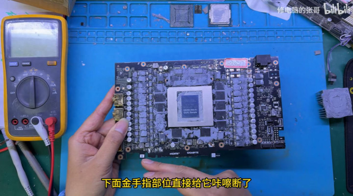 张哥说,这块技嘉的RTX 5090D是一位粉丝在二手平台上花8000块钱淘的,诡异的是PCIe金手指澈底没了,不知谈怎样搞掉的。