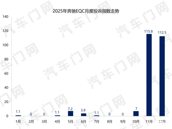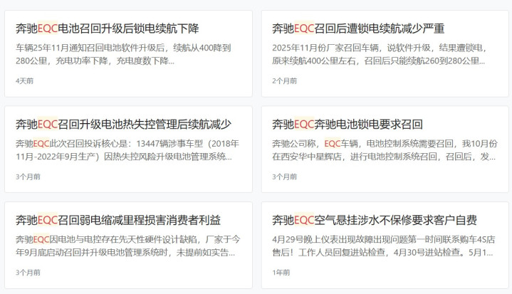 由于销量有限、市集存在感较低,一直以来,奔突EQC的投诉指数并不高。以2025年为例,前10个月,奔突EQC真是齐没遭受投诉。但年底两个月,奔突EQC迎来了一次集结投诉。