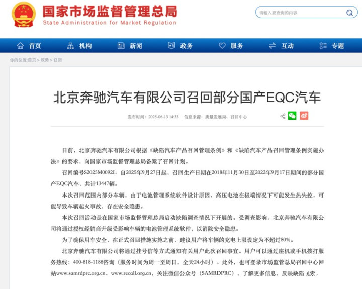 公开信息泄露,2025年6月,北京奔突曾向国度市集监督管束总局备案调回筹备。证实筹备,自2025年9月27日起,北京奔突筹备召复活产日历在2018年11月30日至2022年9月17日历间的部分国产EQC汽车,计较13447辆。