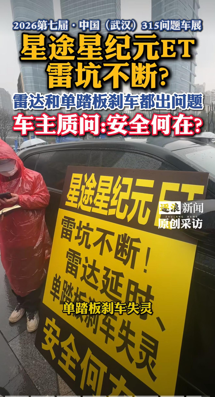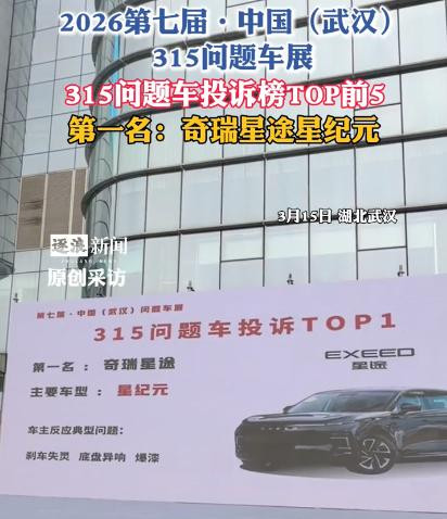 2026 年 3 月 15 日,第七届中国(武汉)315 问题车展在湖北广电门前举行,现场特殊阻止!这里的每一辆车皆贴满了用户发自内心的维权口号。现场公布的投诉榜TOP3中,奇瑞星途星纪元“拔得头筹”,力压飞驰、等品牌,成为本年武汉问题车展的“主角”。
