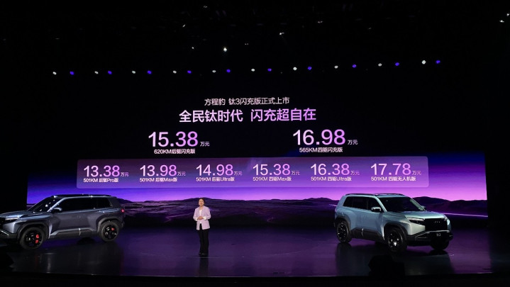 3月13日,方程豹钛3闪充版在深圳迎来了慎重上市,新车这次共推出了后驱、四驱2款竖立车型,售价15.38万-16.98万。