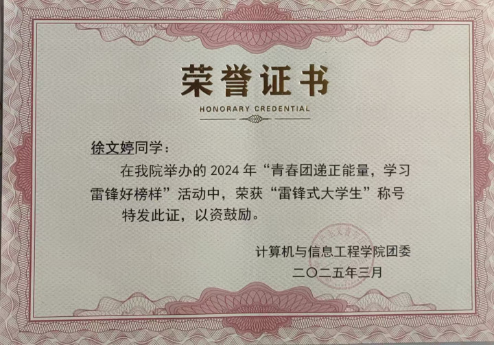 听力费力为徐文婷筑起一谈无形的高墙,但她用双手和双眼为我方凿出了一谈光。小时分,为克服发音费力,她用双手轻触母亲的喉咙,通过声带振动感知发音的节律,一个浅薄的音节,她经常重迭熟识几十遍,直至喉咙嘶哑也不断歇。恰是这份近乎执拗的坚执,让她从不敢启齿讲话,到能畅通相易,致使站上联想机与信息工程学院举办的“诵红色乡信”行为的舞台,用金声玉振的诵读斩获“优秀奖”。她一有知足就泡藏书楼,博览群书、开朗视线,用功提高全面修养,采写的五老精神征文《餐风露宿,历练前行的“钻天榆”》荣获2025年河南省高校“读懂中国”行为大赛二等奖,插足世界大学生英语翻译大赛荣获省级三等奖。因详尽泄漏超过,屡次被新乡学院犒赏为优秀学生干部、优秀后生团聚、雷锋式大学生,还荣获国度励志奖学金。