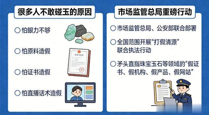 可以这样讲,好多东谈主不是不可爱玉,而是不敢碰玉。怕的不是我方看法不够,怕的是从原料、文凭到直播话术,整套戏早就排好了。你看到的是“良心商家、产地直销”,本色玩的却是“低老本作秀+高情愫收割”的组合拳。也正因为如斯,和玉大叔在阛阓监督管制总局的网站上看到一则重磅音问——阛阓监管总局、公安部长入部署,在天下领域开展传统工艺阛阓“打假清源”长入王法行动,锋芒直指珠宝玉石、贵金属饰品、红木成品等领域的“假文凭、假机构、假居品、假网站”。