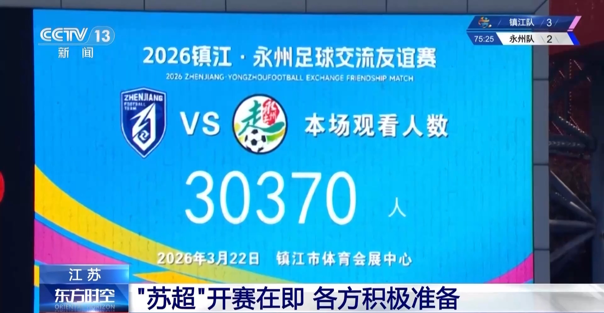 3月22日,镇江·永州足球换取友谊赛在镇江举行。队员们以球会友、以赛促练,3万多名球迷现场呼吁,为球队的每一次比拼加油。