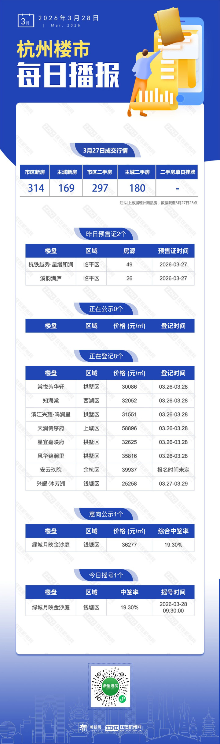 K8官网 3月28日, 杭州新盘5盘预售, 8盘报名中