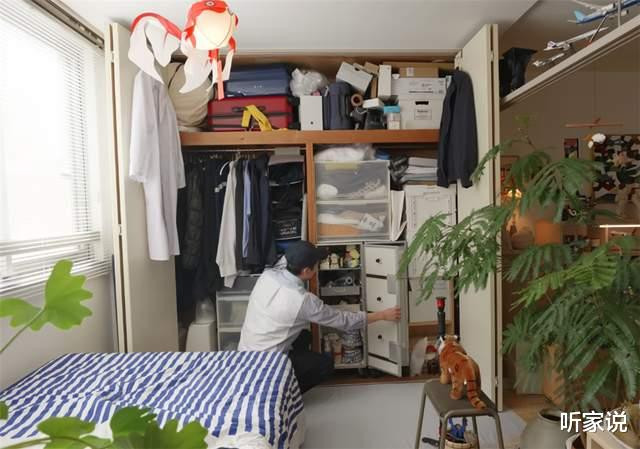 最值得一提的依然床尾的大衣柜,内部塞满了一年四季的一稔和被褥,却井井有条,充满了生计气味。