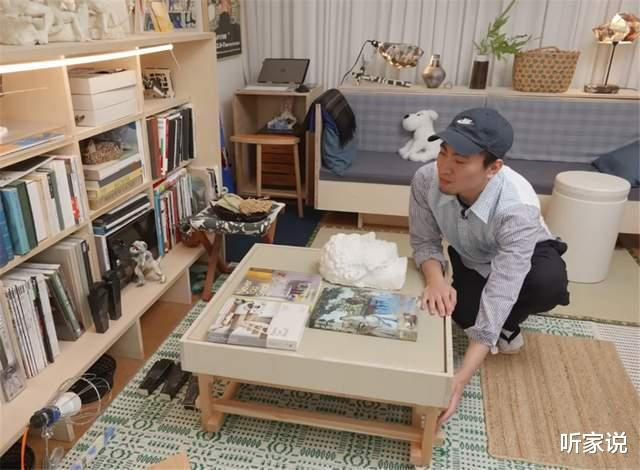 金子亮关于他我方筹备的茶几极度自重,它底部是层叠的木制几腿,踏实性极佳,而台面处则是一个带围边凹槽的筹备,平常里,可以放些水杯手机之类的物品,搭配傍边的书架,就是个阅读角。