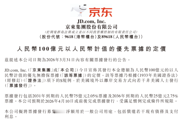 京东集团(09618.HK)于周四(4月2日)发布公告,刊行本金总和为100亿元东说念主民币的优先无担保单子,包括2031年到期的75亿元东说念主民币2.05厘单子、2036年到期的25亿元东说念主民币2.75厘单子,召募资金净额用于一般公司用途,包括偿还多少现存债务及支付利息。