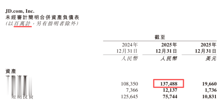 左证京东集团于上月初发布的2025年岁迹诠释,甩手2025年12月31日,京东集团的现款及现款等价物余额为1374.88亿元东说念主民币。