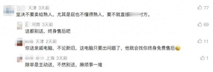不外,他的说法,立马遭到了其他老铁的反驳,暗示,哪怕白送也不行,因为,依旧会给我方带来繁重。有位老铁,还共享了一个关系案例,恰恰即是把我方淘汰下来的电脑白送给亲戚的,也确如实实送了之后,碰到了一大堆繁重。