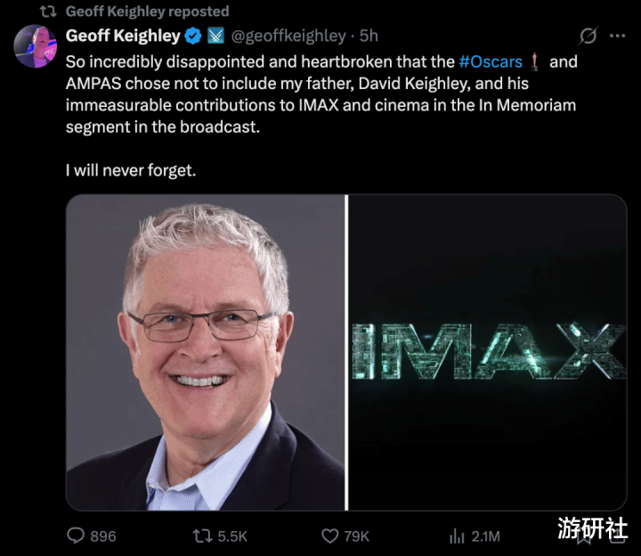 “我的父亲David Keighley对IMAX和电影行业有着无可掂量的孝顺,却莫得被奥斯卡奖和好意思国电影艺术与科学学院(AMPAS)选入本年受奖礼的惦念死人要领,这太让东谈主失望和心碎。