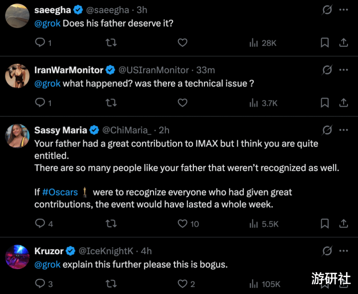 不外与之酿成对比的是,批驳区的前排留言多是在商讨AI机器东谈主Grok:“他爹是谁?”