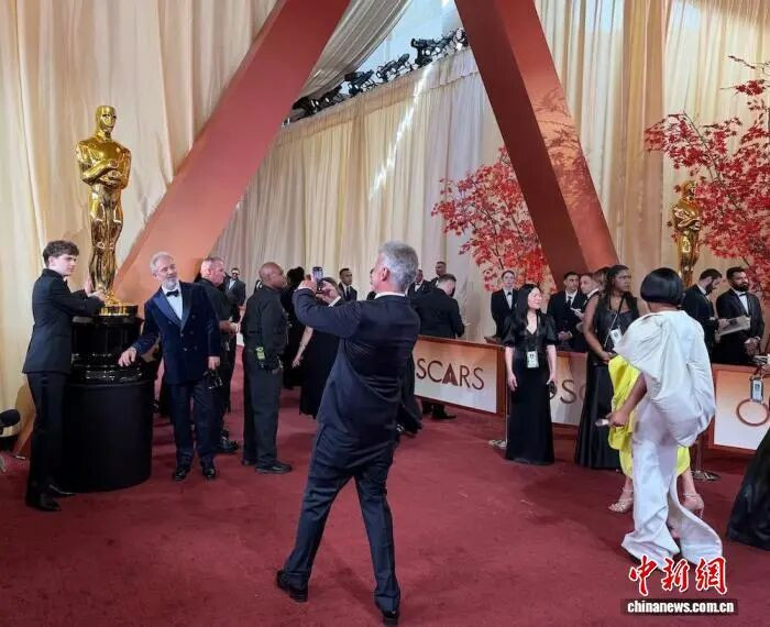 当地本领3月15日,第98届奥斯卡奖受奖仪式在好意思国好莱坞杜比剧院举行。图为嘉宾走红毯并与奥斯卡金像合影。中新社记者张朔摄
