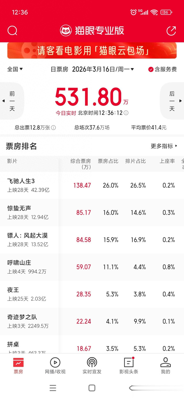 《惊蛰无声》及时票房86万元,略微卓越《镖东说念主:风起大漠》暂居第二。但《镖东说念主》累计票房已卓越《惊蛰无声》近6000万元