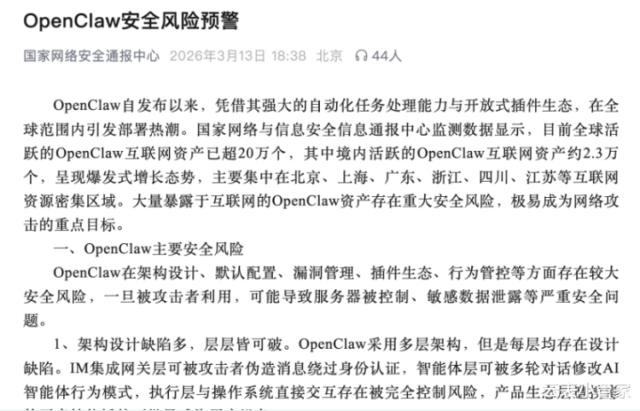 为啥?因为OpenClaw太“野”了。国度集结安全通报中心刚发了预警,说现时国内就有约2.3万个OpenClaw互联网钞票瓦解在外,存在紧要安全风险 。
