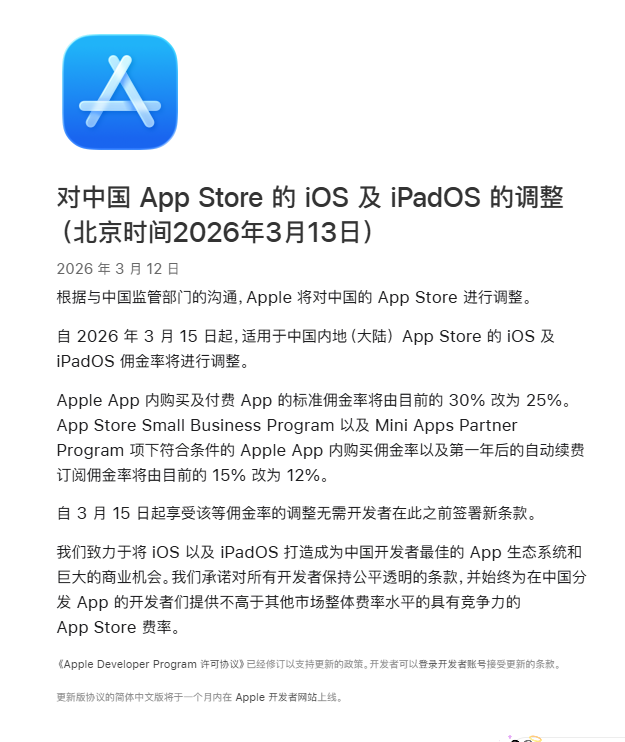 自3月15日起,中国内地App Store标准佣金率从30%降至25%,微型企业及小措施佣金率从15%降至12%。