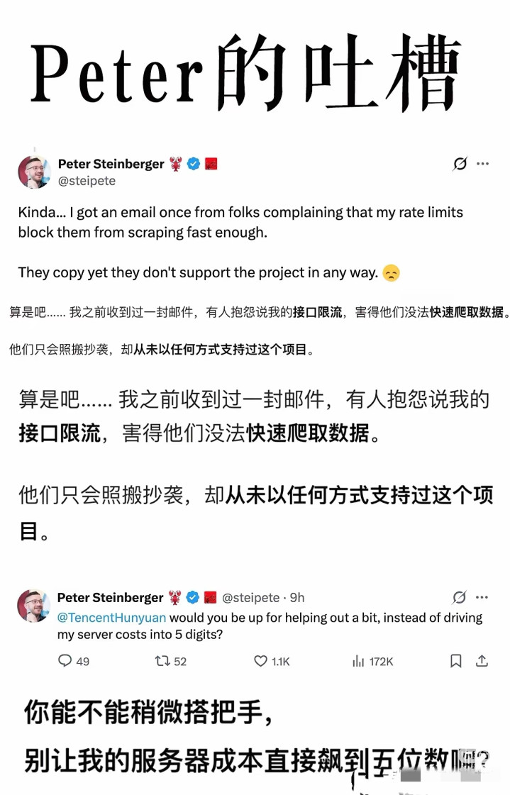最初是龙虾AI创举东说念主的震怒控诉,字字句句王人带着火气,中枢就3点,每极少王人踩在了开源创作家的命门上: