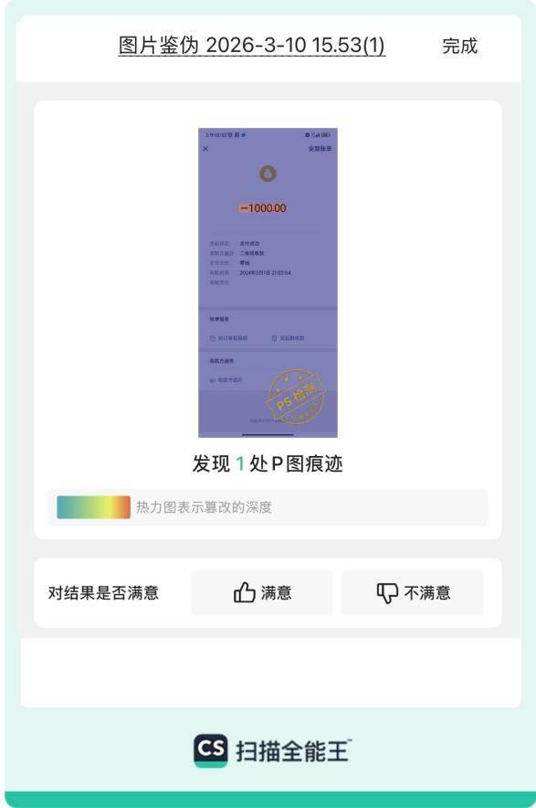 图说:扫描万能王“图片鉴伪”功能识别并标出支付页面截图PS转变陈迹