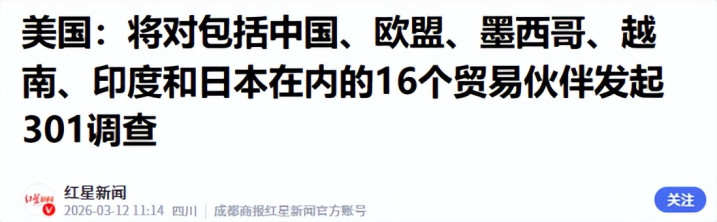 据不雅察者网报说念,好意思国当地工夫3月11日,白宫买卖代表格里尔对外晓示,好意思国将对包括中国、欧盟、墨西哥、越南、印度和日本在内的16个买卖伙伴,发起301考核。格里尔明确暗意,考核限定后,好意思国不摒除对这些国度发起单边制裁,以此来真贵好意思国所谓的“买卖利益”。