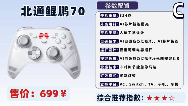 罗致可调阻尼电容摇杆,可在30-100gf限度内更变,精确度可以,玩射击游戏压枪较稳,竞速游戏转向顺滑,但阻尼更变环动弹时略显卡顿。搭载自研AI自适合双切扳机,维持线性与微动切换,震感由4颗急停马达提供,场景适配尚可,但震感线索不够丰富。十字键为北通专利全向款,搓招不串键,玩格斗游戏顺遂,缺欠是按键反馈偏软,永劫辰按压易疲顿。